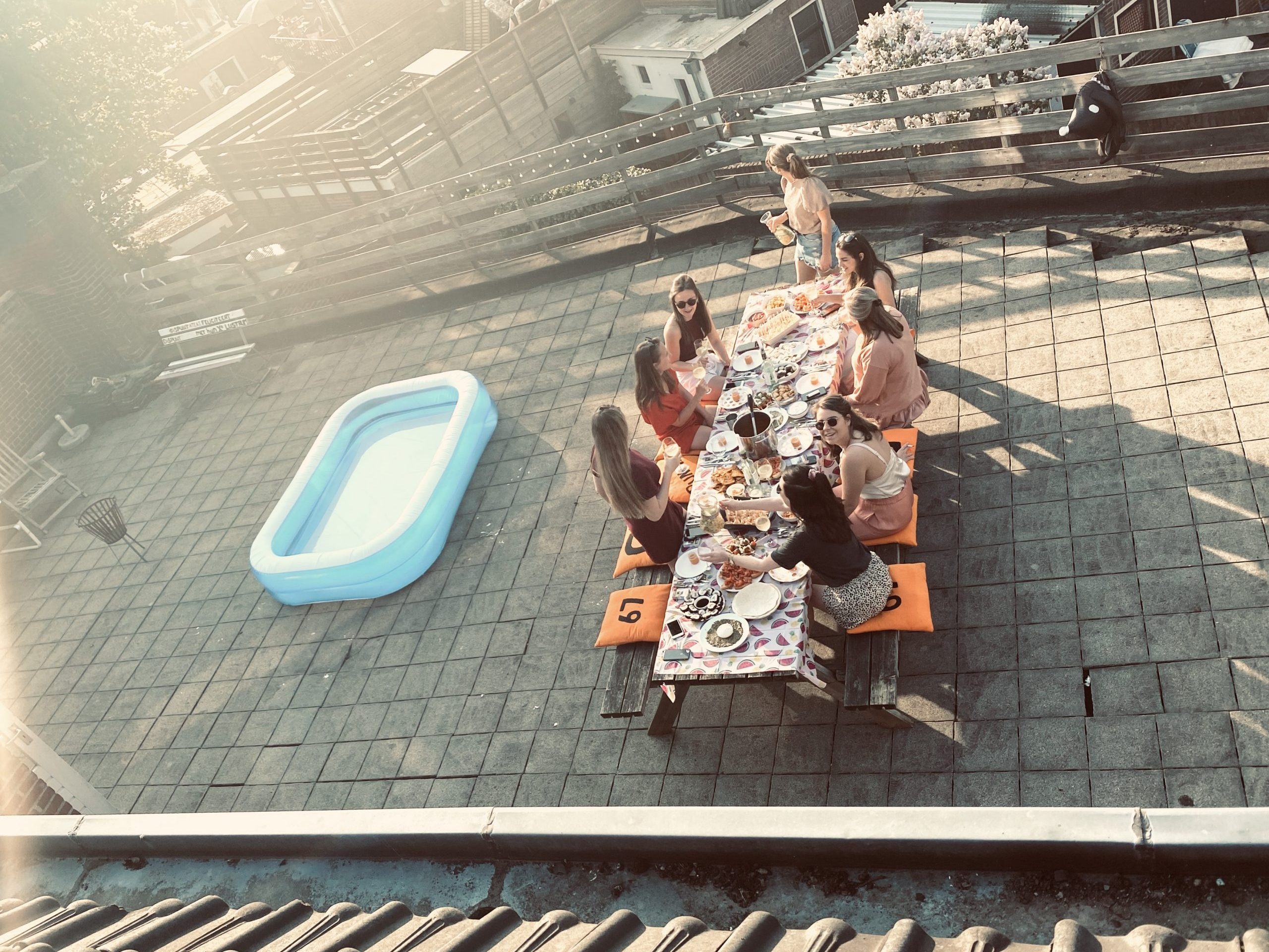 De parel is gezegend met een dakterras van maar liefst 60m2 en ligt de hele dag in de zon! Bakken en braden doen we niet alleen in de zon, maar ook op de BBQ! Elke zomer zetten we een zwembadje op zodat we lekker kunnen afkoelen (met een wijntje in de hand). Verder is ons terras voorzien van een chille loungeset en picknicktafels zodat we lekker buiten kunnen eten.